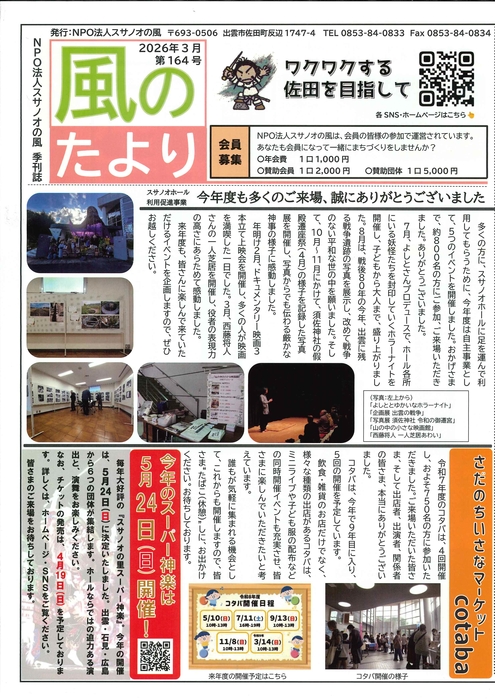 広報誌『風のたより』Home > 広報誌『風のたより』「風のたより」のお知らせ「風のたより」第164号第164号平成15年から毎月発行していた「風のたより」では、令和の時代も様々な情報をお届けいたします。3か月に1度発行していきますのでお楽しみに♪バックナンバー令和7年度令和6年度令和5年度令和4年度令和3年度令和2年度ダウンロードはこちらから令和6年度(4614KB) 令和5年度(4795KB) 令和4年度(2576KB) 令和3年度(4804KB) 令和2年度(7630KB) 令和元年度(4590KB) 平成30年度(4820KB) 平成29年度(7256KB) 平成28年度(7231KB) 平成27年度(8182KB)